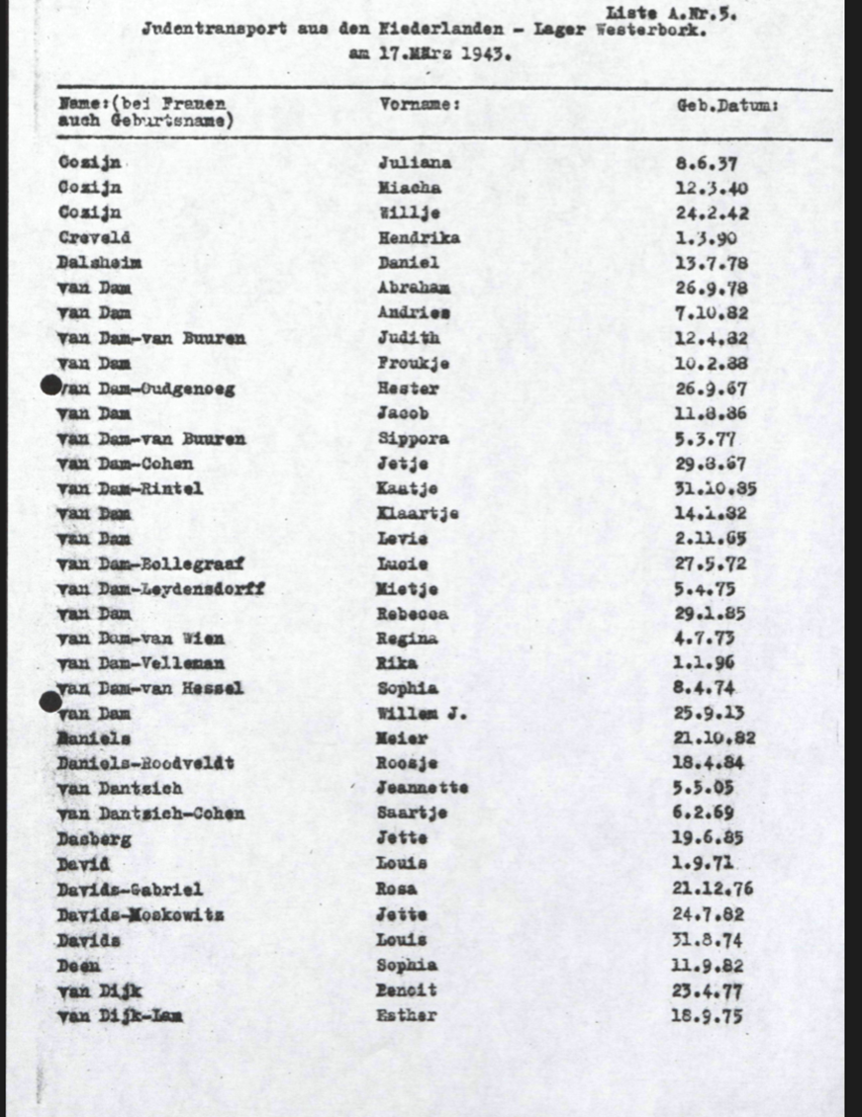 De broers Jacob en Andries van Dam en hun echtgenotes, de zussen Sippora en Judith Van Dam - van Buuren werden via kamp Westerbork getransporteerd naar vernietigingskamp Sobibor (Polen). Daar werden ze alle vier vermoord.